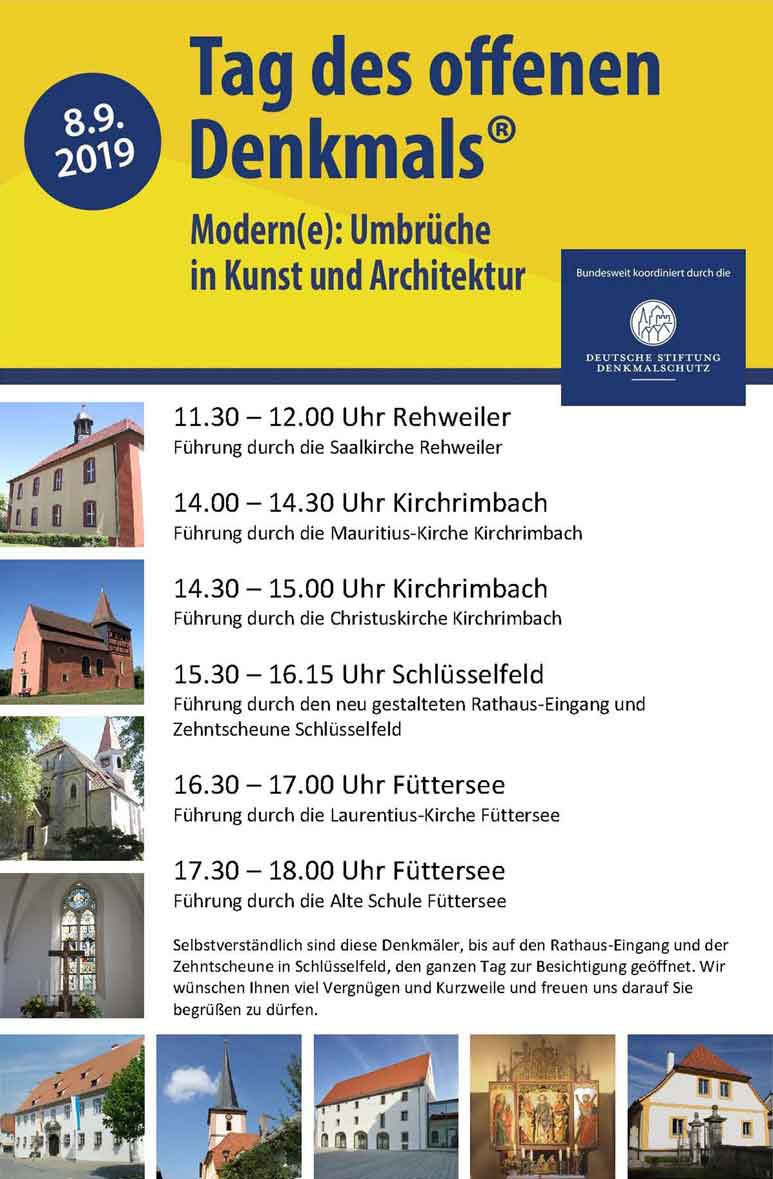 Am Tag des offenen Denkmals am Sonntag, den 08. September 2019 öffnen die Drei-Franken-Eck Gemeinden Markt Burghaslach, Markt Geiselwind und Stadt Schlüsselfeld wieder gerne die Türen ihrer Denkmäler. Ob als Einheimischer oder Besucher, die Sehenswürdigkeiten im Drei-Franken-Eck sind allemal einen Besuch wert. Es wurde an diesem Tag ein vielfältiges Programm erstellt, dass es ermöglicht, alle Führungen an diesen Tag genießen zu können.